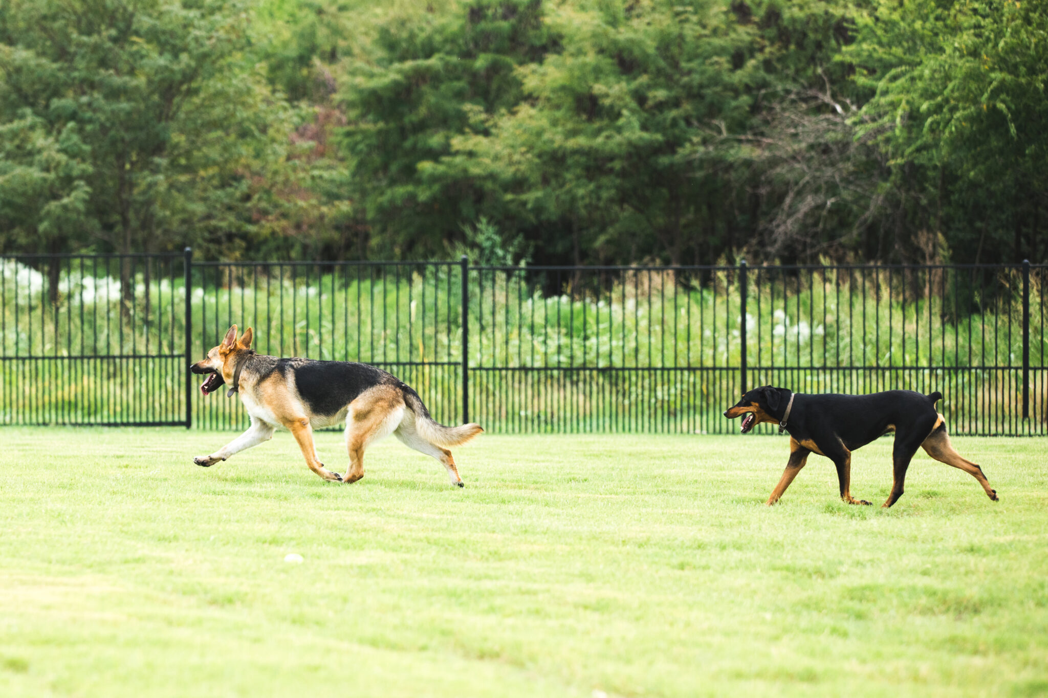 Dogs have ample space to play fetch, meet new doggie pals, chase their tails, and dig up fun. A double-gated entry provides extra assurance getting in and out of the dog park. High iron fences keep even high jumpers safely enclosed.